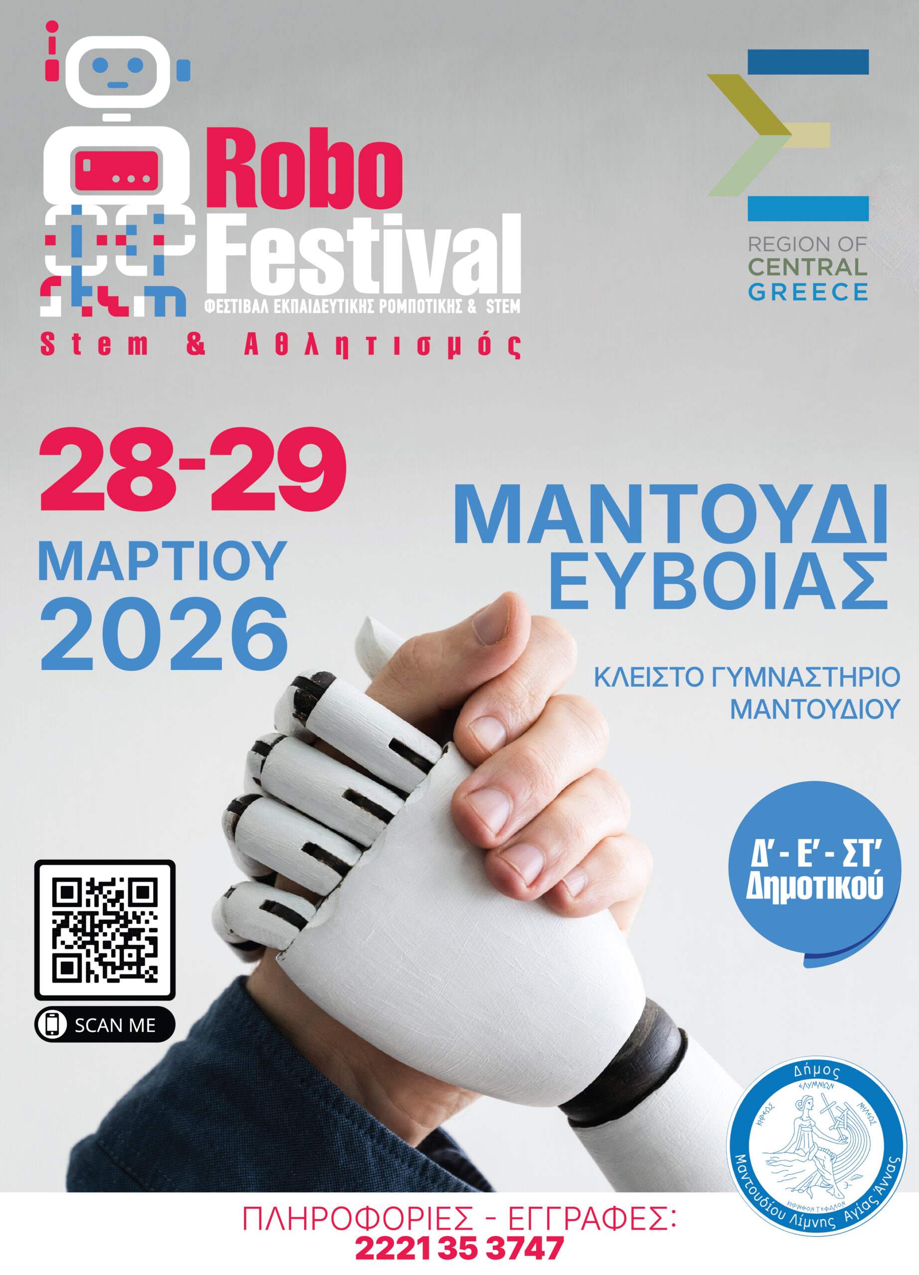 Ένα ξεχωριστό εκπαιδευτικό γεγονός φιλοξενείται στο Μαντούδι, καθώς η Περιφέρεια Στερεάς Ελλάδας διοργανώνει το Φεστιβάλ Εκπαιδευτικής Ρομποτικής «RoboFestival STEM | Robotics – Coding – Engineering – Maths», το Σάββατο 28 και την Κυριακή 29 Μαρτίου 2026, στο Κλειστό Γυμναστήριο Μαντουδίου.
